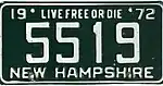 1972 | As 1958 base, but with "72" at top right | "LIVE FREE OR DIE" centered at top | AB123 | County-coded |