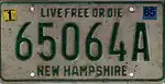 January 1979 – December 1983 | Embossed forest green serial on reflective white plate with border line; "NEW HAMPSHIRE" centered at bottom | "LIVE FREE OR DIE" centered at top | 123456 | 1 to 999999 | |