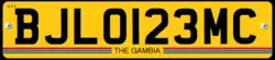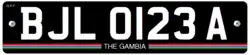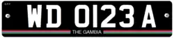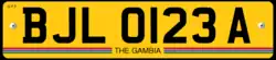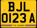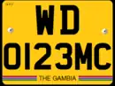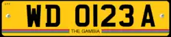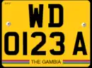 Rear Plate: 27x20 cm Black on yellow Bottom strip in Gambian Flag Text in the center bottom, saying The Gambia |
