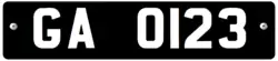 From 1999 a white-on-black colour scheme was introduced, which is similar to an older scheme dating from before independence. The MC in motorcycle plates was moved to the front. This license plate format comes with a strip at the bottom of the plate with the colors of the Gambian flag, and a text in the center that says The Gambia. Standard plates were issued in the font Mandatory.