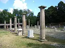Excavations begun on the site in 1760, and were at first successful; the forum and basilica, the thermae and the amphitheatre and private houses with many statues (twelve of marble from the basilica, and a fine bronze head of Hadrian) and inscriptions were discovered.[4] Pre-Roman cremation tombs have also been found, with objects of bronze and iron. But later excavations which were carried on at intervals up to 1876 have given less fruitful results. The oldest dated monument is a bronze tablet with a portion of the text of the Lex Rubria de Gallia cisalpina of 49 BCE which dealt with the administration of justice in Cisalpine Gaul in connection with the extension to it of the privileges of the Roman franchise, the latest an inscription of 276 CE. Most of the objects found are in the museum at Parma.[2]