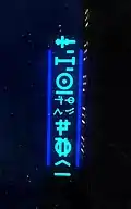 Galactic Trade Standard (GTS) is a fictional language unique to Vendetta Online. Similar to real-world East Asian languages, it includes both phonetic and symbolic alphabets. The phonetic alphabet is simplified to include major human sounds with few letters. The symbolic alphabet includes pictographic representations of objects and ideas relating to trade within Vendetta. The language was constructed to allow traders from foreign nations to communicate with one another easily, as certain nations spent centuries in isolation from each other before regaining contact. GTS can be found throughout the galaxy on projected neon signs outside of space stations, most often advertising goods and services but also sometimes including cryptic messages or humorous phrases.[9]