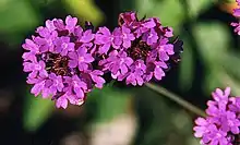 Growing to 60 centimetres (24 in), it has a spreading habit, with stalkless toothed leaves and clusters of bright purple or magenta, scented flowers, held on branched stalks, in summer. Numerous cultivars have been selected for garden use.[4][5][6]