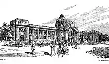 Following the example of the Petit Palais of the Exposition Universelle (1900), built from 1897 onwards, protagonists of the Düsseldorf artistic community in the Verein der Düsseldorfer Künstler and around Fritz Roeber, then secretary of the Kunstakademie Düsseldorf and from 1908 its director, longed for a building for representative art exhibitions in Düsseldorf. To this end, they organised themselves into an association in 1898, which was formally founded on 31 May 1900.[2] Fritz Roeber was unanimously elected chairman of the association, presiding over a board of 12 people.[3] The association's office initially resided in the Malkasten-Haus. By council resolutions of 21 February 1899 and 19 September 1917, the association was granted the privilege of holding art exhibitions in the Kunstpalast at any time.