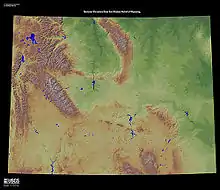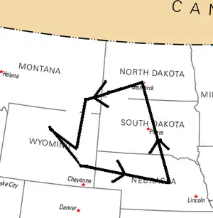 - ↑ Some identify the Bow [eople as Cheyenne who were certainly warlike. Others say Pawnee. The Bow chief had a large lodge which implies a non-nomadic people. Given that the Frenchmen drifted south southwest for six weeks between 9 October and 21 November, it is possible that they had reached the North Platte River north of the Laramie mountains. The Pawnee had large farming villages along the Loup River in Central Nebraska east of Wyoming and south of the Black Hills and expeditions for hunting and war westward into Wyoming were not unlikely. The Snakes were "almost certainly" either the Shoshoni or, less probably, their close relatives the Comanche.[5][4] Both tribes, by virtue of acquiring horses earlier than many other Indians, had emerged recently from the Rocky Mountains to become powers on the Great Plains.