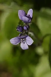 It is a rhizomatous perennial herb producing a decumbent to erect, mostly unbranched stem up to 25 to 40 centimeters tall and coated in long hairs.[3] The oppositely arranged leaves are 2 to 4 centimeters long and lack petioles. The inflorescence is a hairy, glandular raceme of flowers at the tip of the stem. Each flower has hairy, lance-shaped sepals and a blue corolla up to a centimeter wide. The fruit is a capsule around half a centimeter long which contains tiny flattened seeds.[4][5][6]