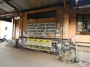 Veyangoda railway station is located in the centre of the town of Veyangoda. It is the 20th station on the Main Line and 37.48 km (23.29 mi) from the Colombo Fort railway station[1] at an elevation of 18.59 m (61.0 ft) above mean sea level.[2] Veyangoda railway station is one of the busiest stations in the Gampaha District, with most of the trains excluding intercity express stopping at the station. Next to station, there is road crossing, which has the highest number of crossings in Sri Lanka.