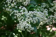Viburnum sieboldii is a large shrub or small tree with opposite, simple leaves, on stout, brittle stems. The flowers are white, borne in spring.
