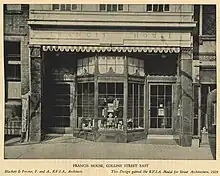 The first medal was presented to Francis House at 107 Collins Street in Melbourne, a narrow fronted five storey office building with a ground level shopfront, designed by architects and cousins Blackett and Forster. William Blackett was the then president of the RVIA in his second term (1928–1930).[4] The building still stands in near original condition. It was built in 1927–1928 for the established pharmacists and chemists, Henry Francis & Co. It was notable for its bronze shopfront details and beige and orange retractable awning, inspired by the shopping streets of Paris and New York, greatly contributing to the characterisation of the area as the 'Paris End' of Collins Street.