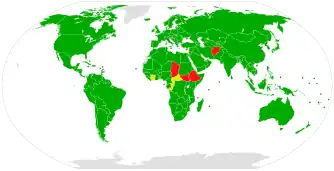 There are 182 state parties to the Convention, including most UN member states and UN observer states Holy See and State of Palestine.[1] The signatory states that have not ratified the Convention are: Central African Republic, Israel, Ivory Coast and Republic of Congo. The UN member states that have neither signed nor ratified the Convention are: Afghanistan, Burundi, Chad, Comoros, Guinea-Bissau, Ethiopia, Palau, San Marino and South Sudan.