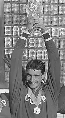 Viktor Georgiyevich Mazanov (Russian: Виктор Георгиевич Мазанов; born 8 March 1947) is a retired Russian swimmer who competed in nine events at the 1964, 1968 and 1972 Summer Olympics. He won two silver and two bronze medals in freestyle and medley relays in 1968 and 1972.[1] He also won one silver in two gold medals in relays at the European championships of 1966 and 1970.[2] During his career he set one world record (4×100 yd medley, 1964) and 13 European (1965–1970) and 26 national (1962–1972) records.[3]