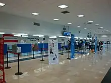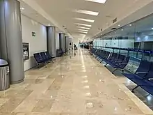 The passenger terminal is a two-story building with a total area of 12,769 square metres (137,440 sq ft). The lower level houses the check-in area, an arrivals hall with two baggage claim carousels, immigration and customs facilities, car rental services, taxi stands, snack bars, a souvenir shop, and a restaurant. The upper floor hosts the security zone and the departure concourse with a commercial area, restaurants, bars, a VIP lounge,[4] and five gates, four of which have jetbridges. The general airport offices are also located on this level. Adjacent to the terminal, other facilities include civil aviation hangars and designated spaces for general aviation.
