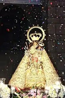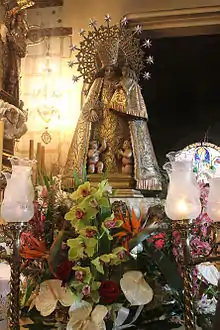 Our Lady of the Forsaken (Spanish: Virgen de los Desamparados or Nuestra Señora de los Desamparados; Catalan: Mare de Déu dels Desamparats, IPA: [ˈmaɾe ðe ˈðew ðelz ðezampaˈɾats]) is a Catholic invocation of the Virgin Mary.[1] She is the patroness of Valencia and one of seven patrons of the Autonomous communities of Spain. She appears with a lily in one hand and in the other, she carries the baby Jesus who bears the cross in his arms. Her posture is characterized by a slight forward tilt, and hence, she is known affectionately as the Geperudeta (hunchback) of Valencia.[2] Her image is housed in the 'Basilica de la Virgen de los Desamparados'.