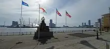 The power station was demolished in 1988–89 and the site was later developed by Barratt Homes.[3] In 1999 Barratt resited the monument onto a paved terrace on the riverbank, opposite the Millennium Dome.[5][4] The missing mermaid was replaced by a bronze sculpture of a mariner's astrolabe, a navigation instrument the expedition would have used, designed by Wendy Taylor.[4] Barratt also added a polished granite plinth with an inscription noting the work done and the relocation of the monument.[4] The renovated monument was unveiled by the US ambassador to Britain Philip Lader in a ceremony supported by the Jamestowne Society and featuring a marchpast by pike and musket re-enactors.[5][4] The site originally had three flagpoles which were used to fly two flags of the United States and the Union Flag; it now has four flagpoles which fly one of each of the flags plus the flag of England and the flag of Virginia.[5]