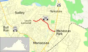 SR 213 begins at the boundary between the city of Manassas Park and Prince William County to the west. Manassas Drive continues west a short distance as SR 1501 to Lomond Drive. The state highway heads east as a two-lane undivided road that winds its way through several residential neighborhoods in the city. SR 213 reaches its eastern terminus at SR 28 (Centreville Road). Manassas Drive continues east as an unnumbered four-lane divided highway that serves the industrial side of town near the Manassas Park Virginia Railway Express station.[1][2]
