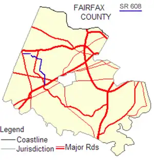 State Route 608 (SR 608) in Fairfax County, Virginia is a secondary state highway which traverses the western portion of the county.[1] Before the Fairfax County Parkway from US 29 to Reston was complete, SR 608 was the main northsouth road in western Fairfax County.