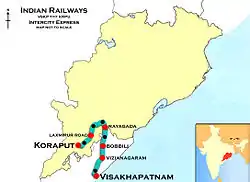 Visakhapatnam–Koraput Intercity Express[1] runs between Visakhapatnam City in Andhra Pradesh and Koraput in Odisha. The train runs through Vizianagaram, Rayagada and Damanjodi. It is numbered 18511/18512 by Indian Railways. The train is maintained by East Coast Railway Zone. The train is hauled by a WDM-3A locomotive of the Visakhapatnam shed.