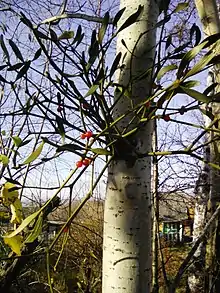 The flowers are inconspicuous, greenish-yellow, 1–3 millimetres (0.039–0.118 in) diameter. The fruit is a berry, white, yellow, orange, or red when mature, containing one or more seeds embedded in very sticky juice; the seeds are dispersed when birds (notably the mistle thrush) eat the fruit, and remove the sticky seeds from the bill by wiping them on tree branches where they can germinate.