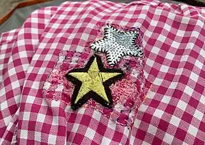 Visible mending is a form of repair work, usually on textile items, that is deliberately left visible (compare to invisible mending). The dual goals of this practice are to adorn the item, and to attract attention to the fact it has been mended in some way. The latter is often a statement of critique on the consumerist idea of replacing broken items with new ones without trying to bring them back to full functionality.[1][2] In other words, the repair is supposed to be a new and distinct feature of the item.