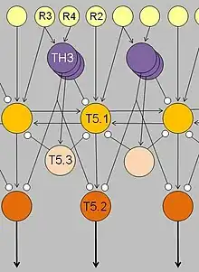 First, the retina is connected to the optic tectum by at least three types of ganglion cells, each with an excitatory receptive field and a surrounding inhibitory receptive field, but they differ in the diameter of their central excitatory receptive fields. Diameters in Class II (R2) ganglion cells are approximately four degrees visual angle. Those in Class III (R3) cells are about eight degrees and Class IV (R4) ganglion cells range from twelve to fifteen degrees. As stimuli move across the toad's visual field, information is sent to the optic tectum in the toad's midbrain. The optic tectum exists as an ordered localization system, in the form of a topographical map. Each point on the map corresponds to a particular region of the toad's retina and thus its entire visual field. Likewise, when a spot on the tectum was electrically stimulated, the toad would turn toward a corresponding part of its visual field, providing further evidence of the direct spatial connections.
