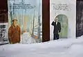 During four summer seasons (2002-2005), Ovchinnikov, a self-taught artist, made about a hundred paintings[5] on the houses of Borovsk, creating on the dull blank walls of city buildings, boarded-up windows, fences, about 90 different subjects (his famous countrymen, churches, historical events, genre scenes: a girl walking on the pipe of a pipeline, an old woman with a bucket near a downspout, a naked boy knocking at the locked door, a man with a giant cucumber in the hands, an old man in his window reading «Times», etc.). Themes are chosen and selected with the help of his wife. Many of the paintings are accompanied by poems written by Elvira.
