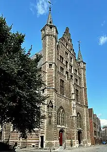 In the Middle Ages, Antwerp was one of the economic centers of Flanders, next to Bruges and Ghent. Because of that, indoor trade markets were founded, one of which was the Vleeshuis. It is not known when the first one was built. The second Vleeshuis was built in 1250 near the castle of Antwerp.[1] It was commissioned by the Duke of Brabant and paid for by the city of Antwerp.[2] A central meat market enabled the city to regulate the meat industry, limiting the number of butchers permitted to sell to 52.[3] The building may have also functioned as a slaughterhouse.[3] In 1290, John I, Duke of Brabant recognized the guild of Antwerp butchers, resulting in butchers' guild being the oldest trade guild in Antwerp. In time, many of the butcher families became wealthy.[3] The Vleeshuis functioned as a commercial center for selling slaughtered animals.