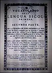 Lisboa, a Franciscan friar, resided in the Philippines from 1586 until 1618. He served in Ambos Camarines, where Bicol was widely spoken, from sometime between 1592 and 1602 until 1616. Lisboa died in Mexico in 1628.[1] The Vocabulario was first published posthumously in 1754. A second edition of the Vocabulario was published in 1865 under the expressed order of Bishop Francisco Gainza. It contained 10,495 (Bikol-Español) word entries in 417 pages using 22-inch (560 mm) x 33-inch (840 mm) paper and 5,588 entries in the (Español-Bicol) section in 103 pages. Realubit describes the Bicol vocabulary as "broad in social scale and localization", but criticizes Lisboa's presentation of grammatical tense, affixes, and parts of speech.[2]