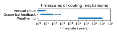 The weathering of a sufficiently large volume of rapidly erupted volcanic materials has been proposed as an important factor in Earth's silicate weathering cycle, which operates on a timescale of tens of millions of years.[20] During this process, weathered silicate minerals react with carbon dioxide and water, resulting in the formation of magnesium carbonate and calcium carbonate. These carbonates are then removed from the atmosphere and sequestrated on the ocean floor. The eruption of a large volume of volcanic materials can enhance weathering processes, thereby lowering atmospheric CO2 levels and contributing to global temperature reduction.
