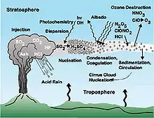An explosive volcanic eruption releases magma materials in the form of volcanic ash and gases into the atmosphere. While most volcanic ash settles to the ground within a few weeks after the eruption, impacting only the local area for a short duration, the emitted SO2 can lead to the formation of H2SO4 aerosols in the stratosphere.[1][2] These aerosols can circle the hemisphere of the eruption source in a matter of weeks and persist with an e-folding decay time of about a year. As a result, they have a radiative impact that can last for several years.[3]