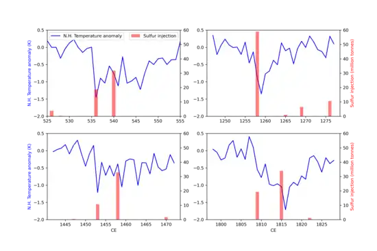 | 536–546 | 535 N.H. mystery eruptions, 540 tropical mystery eruption | −1.4 K | The first phase of Late Antique Little Ice Age. | [15][27] |