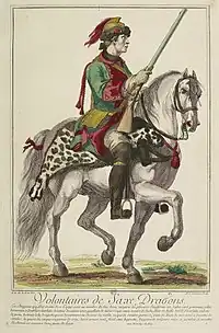 The Volontaires de Saxe (also known as Volontaires du Maréchal de Saxe) were a military unit of cavalry troops recruited by French field marshal Maurice de Saxe. It consisted of dragoons in European military dress and uhlans (lancers) inspired by Turkish fashion. Both wore a messing helmet inspired by the ancient Phrygian helmet. A troops of lancers, composed of black men, guarded the Château de Chambord, his residence. After the death of de Saxe in 1750 the whole unit was turned into dragoons and eventually came to be known régiment de Schomberg.