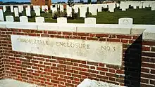 Enclosure 3 was founded in February 1915 by Princess Patricia's Canadian Light Infantry, expanded by later use by other units. The enclosure was expanded by concentration after the Armistice from nearby smaller sites.[4] Also interred in Enclosure 3 are the dead of the Hampshire Regiment and others who reclaimed the area from German hands in September 1918.[4]