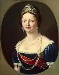 The Napoleonic Wars had drastically changed the balance of power in Europe, but especially in Germany. There Napoleon had reorganized the territories of the former Holy Roman Empire into several new French satellite states. Among those was the Kingdom of Württemberg, ruled by King Frederick I, previously Duke Frederick II, who had been coerced into alliance with Napoleonic France. In exchange for fealty to France and auxiliary Württemberger troops, Frederick was rewarded with land from smaller German states and increased rank and status. At the Congress of Vienna, Frederick was able to keep his gains thanks to his connections to the United Kingdom and the Russian Empire. While traveling to England in 1814, William, Crown Prince of Württemberg, met Grand Duchess Catherine Pavlovna of Russia, his cousin and a recent widow.[2][3] The two fell in love,[2] but William was already married to a Bavarian princess, Caroline Augusta of Bavaria.[4] The pair met again in Vienna and resolved to marry,[2] leading William to obtaining a speedy divorce from Princess Caroline on the basis of non-consummation.[4] That same year, 1816, Catherine and William were wed, strengthening already strong ties between Württemberg and Russia.[3][4][5]