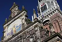 Atop the façade of the building is the Latin proverb: "SPQA RESTITVIT VIRTVS ABLATAE JVRA BILANCIS". This means : SPQA (Senatus PopulusQue Alkmaris - Council and People of Alkmaar) by virtue of its courage and strength, restored the rights to the balance to the people and government of Alkmaar." This refers to a battle against Spanish Roman Catholics, which, upon the truce of October 8, 1573, established the rights of the citizens to have a weigh house.