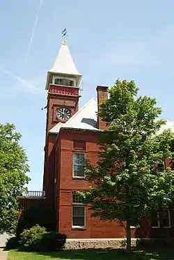Walpole Town Hall is a historic town hall building at 972 Main Street in Walpole, Massachusetts, USA. The two-story brick building was designed by J. Williams Beal and completed in 1881. The building exhibits Classical Revival with Romanesque elements. Its most prominent feature is its 70-foot (21 m) square clock tower, topped by a pyramidal roof. The entrance is recessed at the base of the tower, under a large round-arch opening trimmed in brownstone.[2]