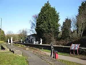 Warmley was a small railway station just south of Mangotsfield on the Midland Railway Mangotsfield and Bath Branch Line. The station was sited just north of a level crossing on the A420 road through the village. It had wooden buildings: the shelter on the down platform (towards Bath) survives and is used on occasion as a refreshment stop on the Bristol & Bath Railway Path, which follows the route of the railway.[2]