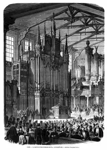 In 1969 the Warrington Corporation decided that a £9,000 restoration of the instrument was not a viable proposition. But following a publicity drive by local people who formed the Cavaillé-Coll Organ Retention Committee the Corporation agreed to retain the organ if the money could be raised. The Corporation generously added to the sum raised by the Committee to ensure that essential maintenance work went ahead.[6] On completion of the work a celebratory concert took place, on 23 November 1972, featuring the organists Gilbert Kennedy and Nicholas Kynaston, with massed Warrington choirs.[7]