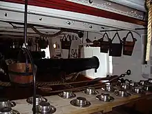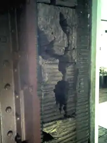 The gun ports of the Warrior-class ships were built 46 inches (1.2 m) wide, which allowed the 68-pounders to traverse 52°. While the ships were being built the directing bar was developed which consisted of an iron bar that fastened to a pivot bolt in the sill of the gun port. After the gun carriages were modified, this allowed them to pivot much closer to the gun port than had previously been possible and meant that the gun ports could be narrowed to a width of 24 inches (0.6 m) while retaining the same arc of fire.[20] The gun ports were narrowed to the new width by 7 inches (178 mm) of wrought iron.[6] Another delay was the modification of the armour plates with tongue and groove joints to lock the plates together and increase their resistance to armour-piercing shells. All together these modifications delayed the completion of Warrior by a year past her contract completion date.[5]