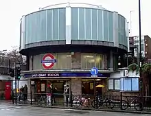 Close to the southern end, with its main entrance on Warwick Road, was the Earls Court Exhibition Centre built from 1935 to 1937 and demolished in 2017 to be replaced by apartment blocks and shops.[7] Opposite is the grade II listed 1937 extension to Earl's Court tube station, a rotunda of brick and glass with a 1970s circular atrium that Historic England describe as being of "no merit".[8]