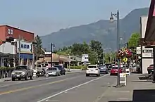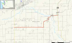 SR 544 begins at a roundabout with SR 539 (the Guide Meridian) on the south side of Wiser Lake near Lynden. The highway travels east on Pole Road through farmland and passes a housing subdivision near the Raspberry Ridge Golf Course.[2] SR 544 continues due east along Fourmile Creek and turns north at a junction with Everson Goshen Road near several gravel pits and the Nooksack Indian Reservation. After passing several industrial businesses, the highway turns northeast to enter Everson and turns north onto Mead Avenue near the city's elementary school. SR 544 then turns east once again at Kale Street and continues northeast onto Everson Road as it crosses the Nooksack River alongside a section of the Bay to Baker Trail.[3] The highway travels east through downtown Everson on Main Street, passing several businesses, the city hall, and a branch of the Whatcom County Library System.[4] SR 544 continues across a small patch of farmland to neighboring Nooksack, where it becomes Columbia Street and runs for several blocks on the southern outskirts of the town.[5] SR 544 terminates at a junction with SR 9, which uses a block Columbia Street to cross over the BNSF Railway's Sumas Subdivision before continuing north towards Sumas and south towards Sedro-Woolley.[6][7]