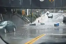 Water can produce a natural disaster in the form of tsunamis, hurricanes, rogue waves and storm surge. Land-based floods can originate from infrastructural issues like bursting dams or levee failure during surges, as well as environmental phenomena like rivers overflowing their banks during increased rainfall events, urban stormwater flooding, or snowmelt.[48][49][50] The increased magnitude and frequency of floods are a result of urbanization and climate change.[50][49] Urbanization increases stormwater runoff during large rain events. Surface runoff is water that flows when heavy rains do not infiltrate soil; excess water from rain, meltwater, or other sources flowing over the land. This is a major component of the water cycle.[51] Runoff that occurs on surfaces before reaching a channel is also called a nonpoint source. When runoff flows along the ground, it can pick up soil contaminants including, but not limited to petroleum, pesticides, or fertilizers that become discharge or nonpoint source pollution.[52][13][53]