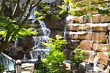 Waterfall Garden Park, also called UPS Park and UPS Waterfall Park, is a private 60-by-80-foot (18 m × 24 m) pocket park in Seattle, Washington, created in 1978 at the original United Parcel Service building in Pioneer Square. It is open to the public during the day and closed at night. The park was designed by Masao Kinoshita with Sasaki Associates[2][3] and funded by Annie E. Casey Foundation to commemorate UPS's founder, James Casey.[4] The park is named for a manmade 22-foot (6.7 m) tall waterfall over which is pumped 5,000 US gallons (19,000 L) of water per minute.[4] It is described as "one of the most expensive parks per square foot ever built in the United States".[5] Roger Sale says in the guidebook Seeing Seattle that the park is locked at night to keep out the sizeable Pioneer Square homeless population.[6]