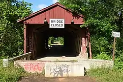 The Waterford Covered Bridge is a Town lattice truss covered bridge spanning LeBoeuf Creek in Waterford Township, Erie County in the U.S. state of Pennsylvania. The bridge was built in 1875, and is 85 feet 11 inches (26.2 m) in length. The Waterford Covered Bridge is one of two remaining covered bridges in Erie County, along with the Harrington Covered Bridge. The bridge is also the only Town lattice truss bridge in the county and one of only 19 in Pennsylvania. It was documented by the Historic American Buildings Survey in 1936 and was listed on the National Register of Historic Places in 1980. In 2011, the bridge was closed due to its deteriorating condition.