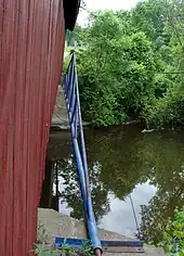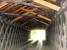 The bridge was designed by Richard Cross using a Town lattice truss.[3] The truss consists of a lattice of beams crossing at 45 to 60-degree angles and connected by wooden pins.[5] There are only nineteen bridges remaining in Pennsylvania using the Town lattice, and the Waterford Covered Bridge is only one in Erie County.[6] It is the also the only covered bridge in the county to have been painted, with the exterior of the bridge painted barn red.[2] The bridge also has "an unusual, blue, metal pipe structure" attached to the abutments on the bridge's south side.[2] The structure is supported with a king post framework and, presumably, connects to nearby pipelines.[2]
