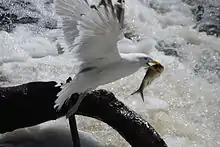 Today, a fish ladder provides access to upstream spawning habitat as part of a system of fish passages that provide access up to river mile 20.[6] The high concentrations of blueback herring and alewife below the dam in the spring make it a popular fishing spot for herring gulls, great black-backed gulls, great blue herons, night herons and cormorants.