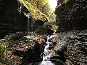 The centerpiece of the 778-acre (3.15 km2)[4] park is a 400-foot-deep (120 m) narrow gorge cut through rock by Glen Creek, a stream that was left hanging when glaciers of the Ice age deepened the Seneca valley, increasing the tributary stream gradient to create rapids and waterfalls wherever there were layers of hard rock. The area's rocks are sedimentary of Devonian age, part of a dissected plateau that was uplifted with little faulting or distortion. They consist mostly of soft shales, with some layers of harder sandstone and limestone.