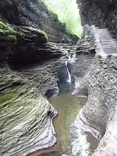 One such hanging valley, overlooking the south end of the Seneca Lake valley, evolved into the deep gorge of Watkins Glen. The steep drop of Glen Creek into Seneca Valley created a powerful torrent that eroded the underlying rock, cutting further and further back towards the stream's headwaters. This erosion was not a uniform process: the rock here includes shale, limestone, and sandstone, and these types of rock erode at different rates, leaving behind a staircase of waterfalls, cascades, plunge pools, and potholes. Watkins Glen State Park now encompasses nineteen waterfalls spaced along a trail roughly two miles (3.2 km) long.[8]