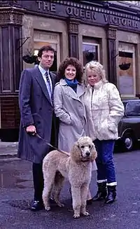 The Watts family were one of the central families introduced to viewers when EastEnders began in 1985, created by the show's co-creators Tony Holland and Julia Smith. Holland and Smith had correctly anticipated the importance The Queen Vic setting would have to EastEnders and therefore intended the Watts to be highly dynamic and vibrant characters fuelling the drama of the show,[4] something that has largely been a hallmark of the family ever since, even as new members have been added, with the character of Dennis a popular favourite among audiences, winning various soap and television awards,[5] and Chrissie largely the "centrepiece" of the show during her tenure.[6] The Watts were originally composed of Den and Angie and their adoptive daughter Sharon. The early focus of the family was on the tempestuous marriage between Den and Angie, rooted in Den's womanising and the couple's many heated arguments. Indeed, Den's wandering eye is a central element in the family affairs of the Watts family and would frame many of their storylines over the years, leading him into affairs with women including Jan Hammond (Jane How), Kate Mitchell (Jill Halfpenny), and finally Zoe Slater (Michelle Ryan). In May 1986, Sharon's 17-year-old friend Michelle Fowler (Susan Tully) gave birth to Vicki, the product of an illicit relationship with Den (who was almost 40 years old). And in 2003 it was revealed that Den had fathered another child - Dennis Rickman (Nigel Harman) - as a result of another affair 30 years earlier.