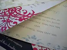 Historically, wedding invitations were hand-written unless the length of the guest list made this impractical.[4] When mass-production was necessary, engraving was preferred over the only other widely available then option, which was a relatively poor quality of letterpress printing. Hand-written invitations, in the hosts' own handwriting, are still considered most correct whenever feasible; these invitations follow the same formal third-person form as printed ones for formal weddings and take the form of a personal letter for less formal weddings.[4] Tissues are often provided by manufacturers to place over the printed text. Originally, the purpose of the tissue was to reduce smudging or blotting, especially on invitations poorly printed or hastily mailed before the ink was fully dried, but improved printing techniques mean they are now simply decorative.[5] Those who know that their original purpose has been made irrelevant by dramatic improvements in printing technology usually discard them.[6]