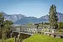 From top, Wellington CBD, with the NG Mother Church and snowy Wemmershoek Peak beyond. Dutch Reformed Church Complex in Wellington (centre left). Lady Loch Bridge over the Berg River (centre right). Coronation Arch in Victoria Jubilee Park (bottom left). Second Boer War block house (bottom right).